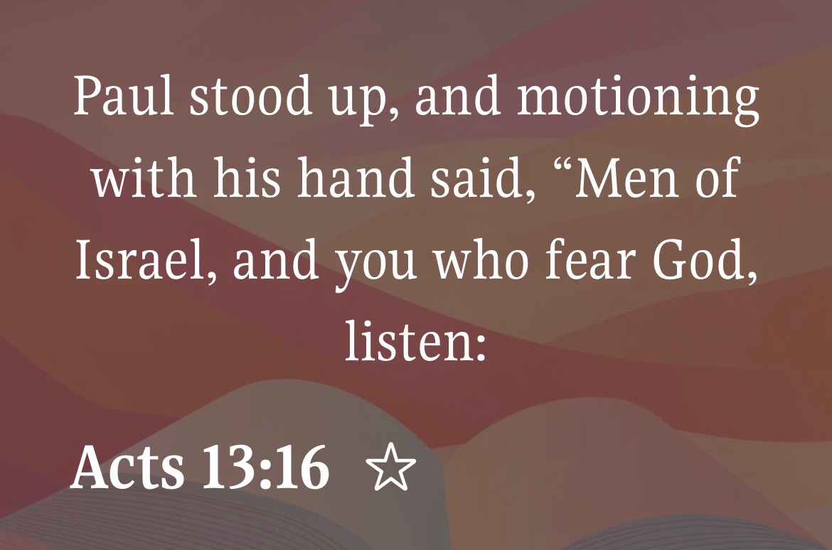 “Paul stood up, and motioning with his hand said, “Men of Israel, and you who fear God, listen:” - Acts 13:16
