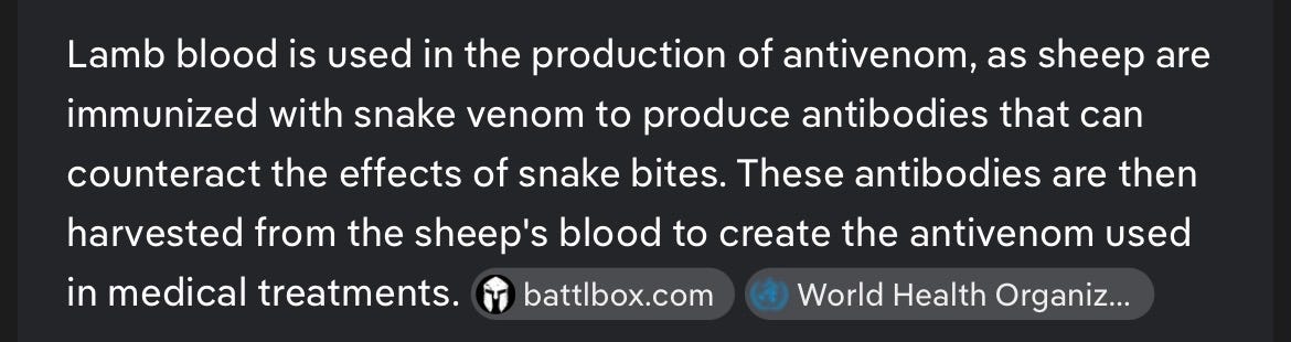 Lamb’s BloodAnd The SnakePaul FleuretDec 27, 2025285ShareDid y’all know lamb’s blood can be used to create Anti-Venom for snake bites? Crazy, cuz I coulda sworn Jesus was the lamb and Satan was the snake … https://sheepgoatinsights.com/is-anti-venom-really-made-from-sheep-blood/amp/