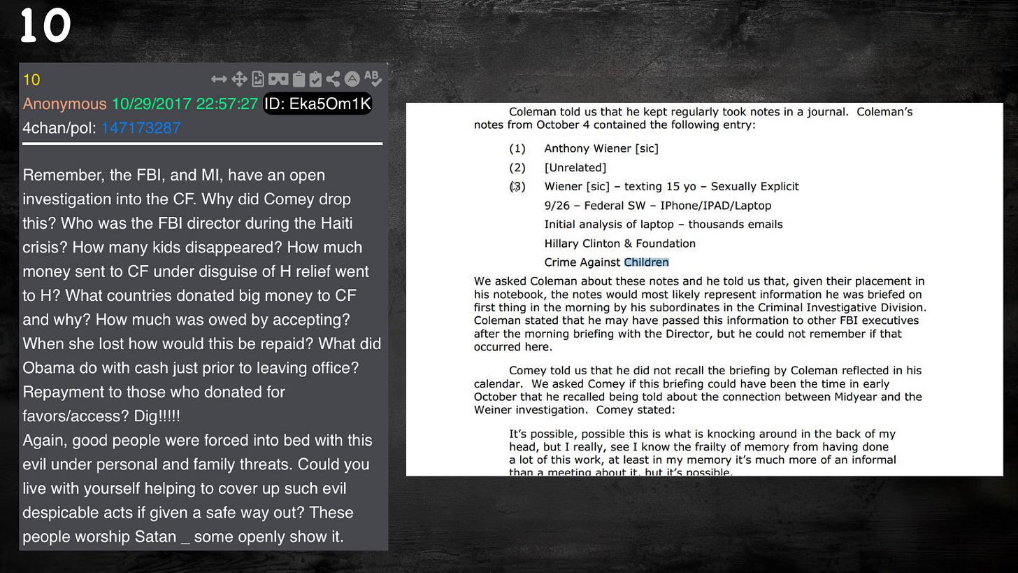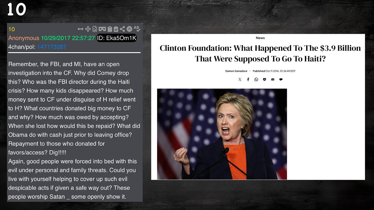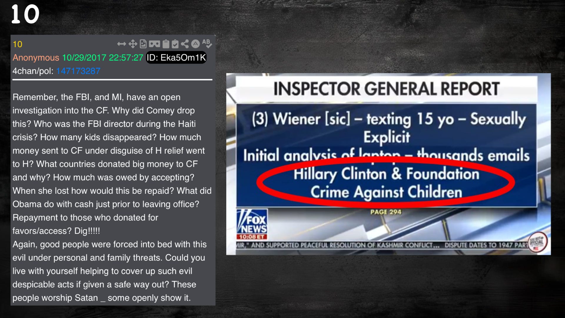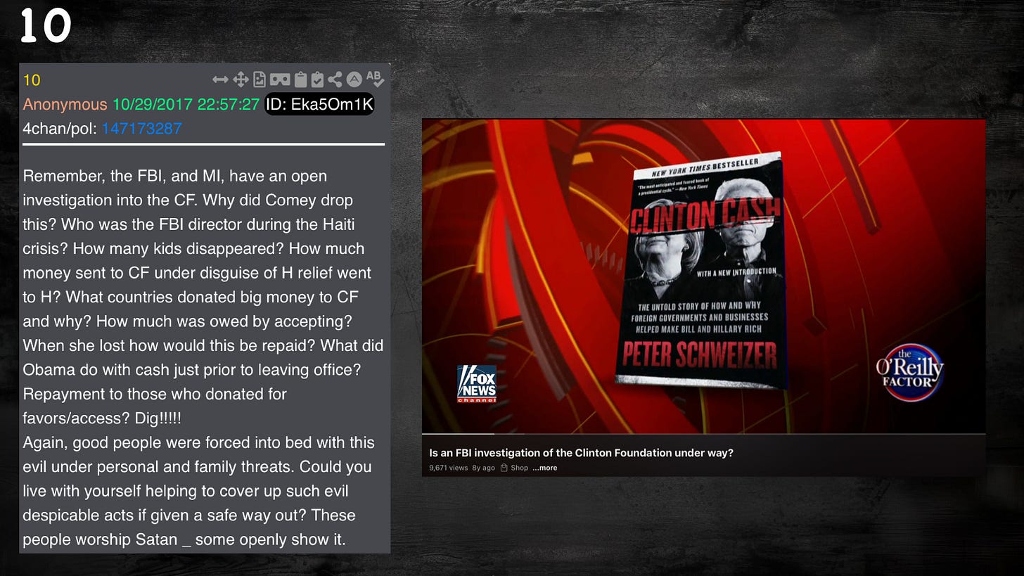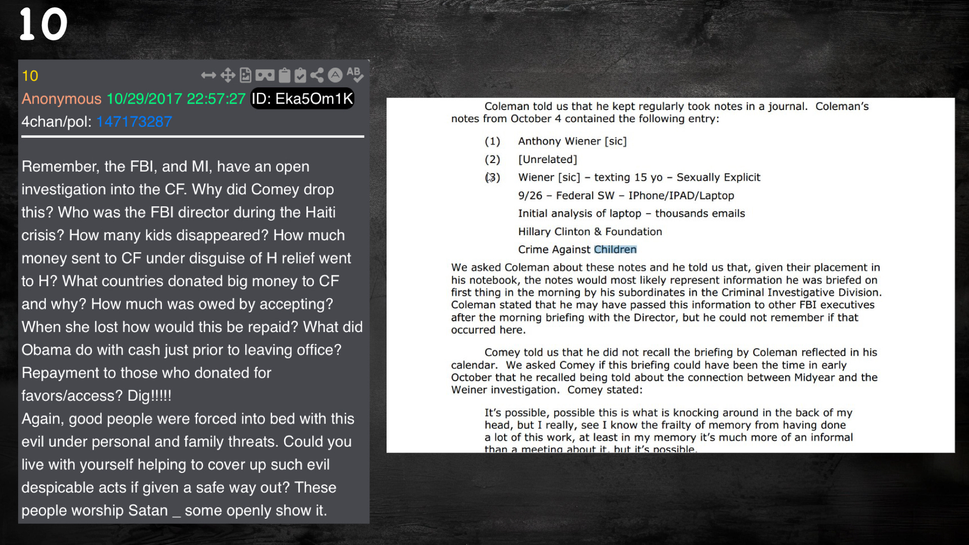 Q starts Drop 10 off by reminding us that the Clinton Foundation was under investigation by not only the FBI, but Military Intelligence. This Fox News clip dives into it a bit deeper:
