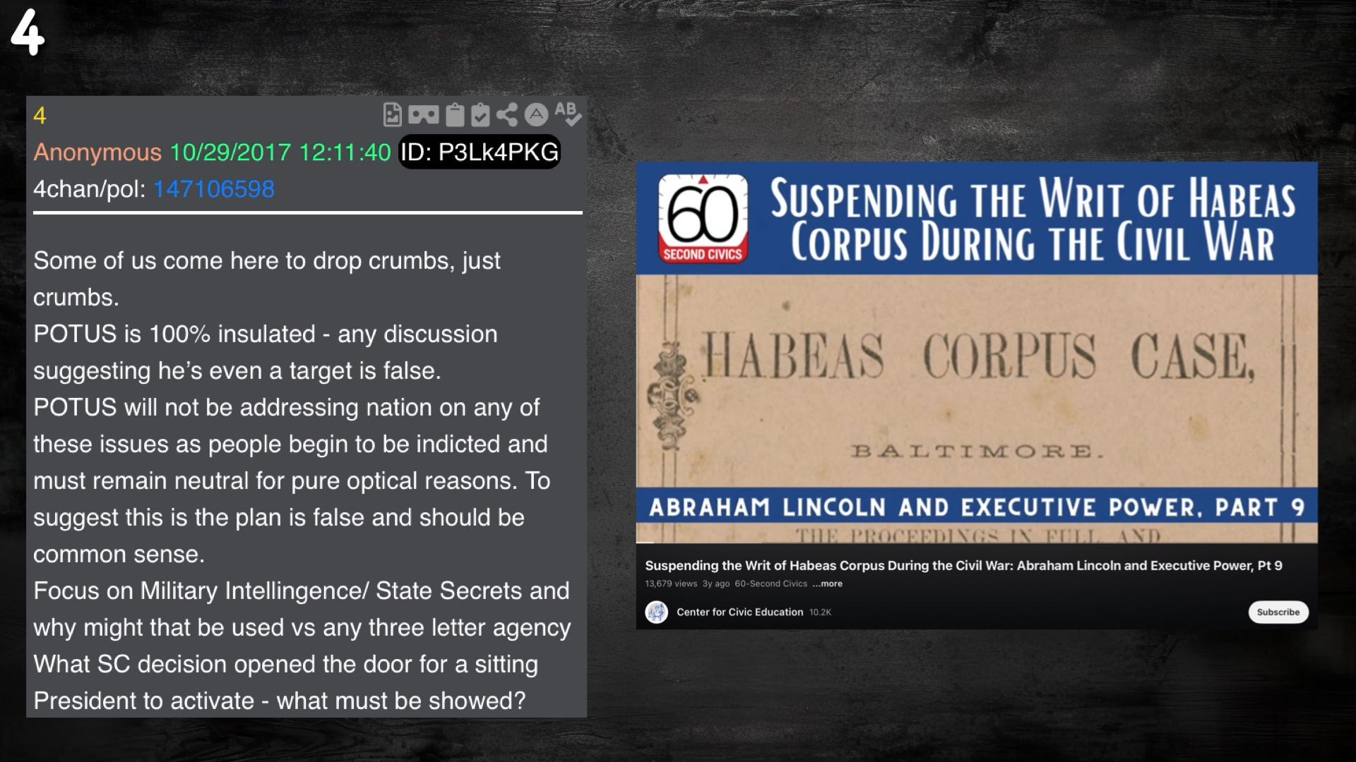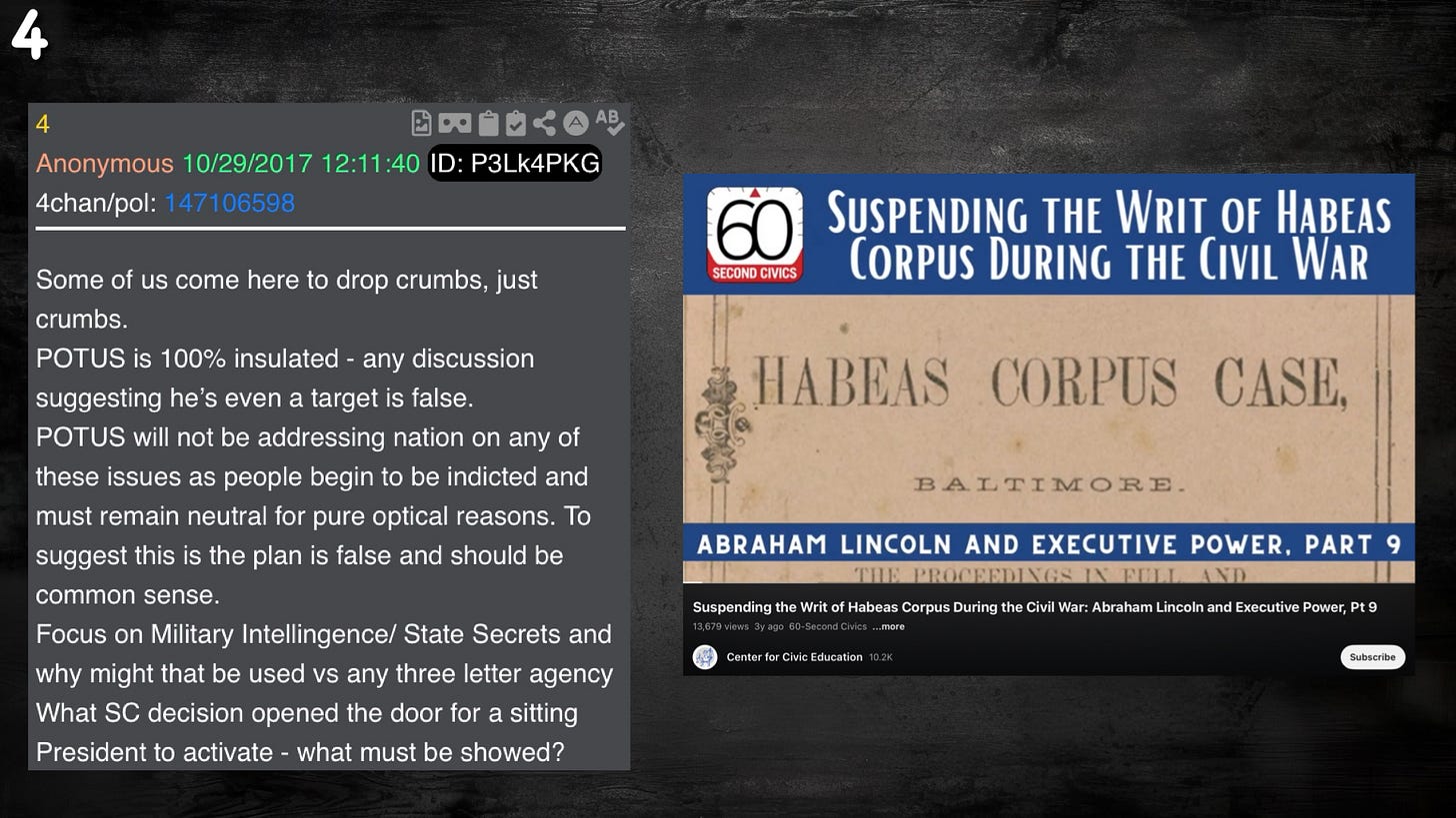This drop starts by telling us that the Q team’s job is essentially to give us the crumbs. It is our job to put them all together. Q then tells us that POTUS is insulated (or safe) - any suggestion otherwise is false. We are then told that when all of this goes down, that President Trump will not be addressing the nation - that he must remain neutral for optical reasons (I.E: This cannot appear to be politically motivated and he cannot appear like a dictator).