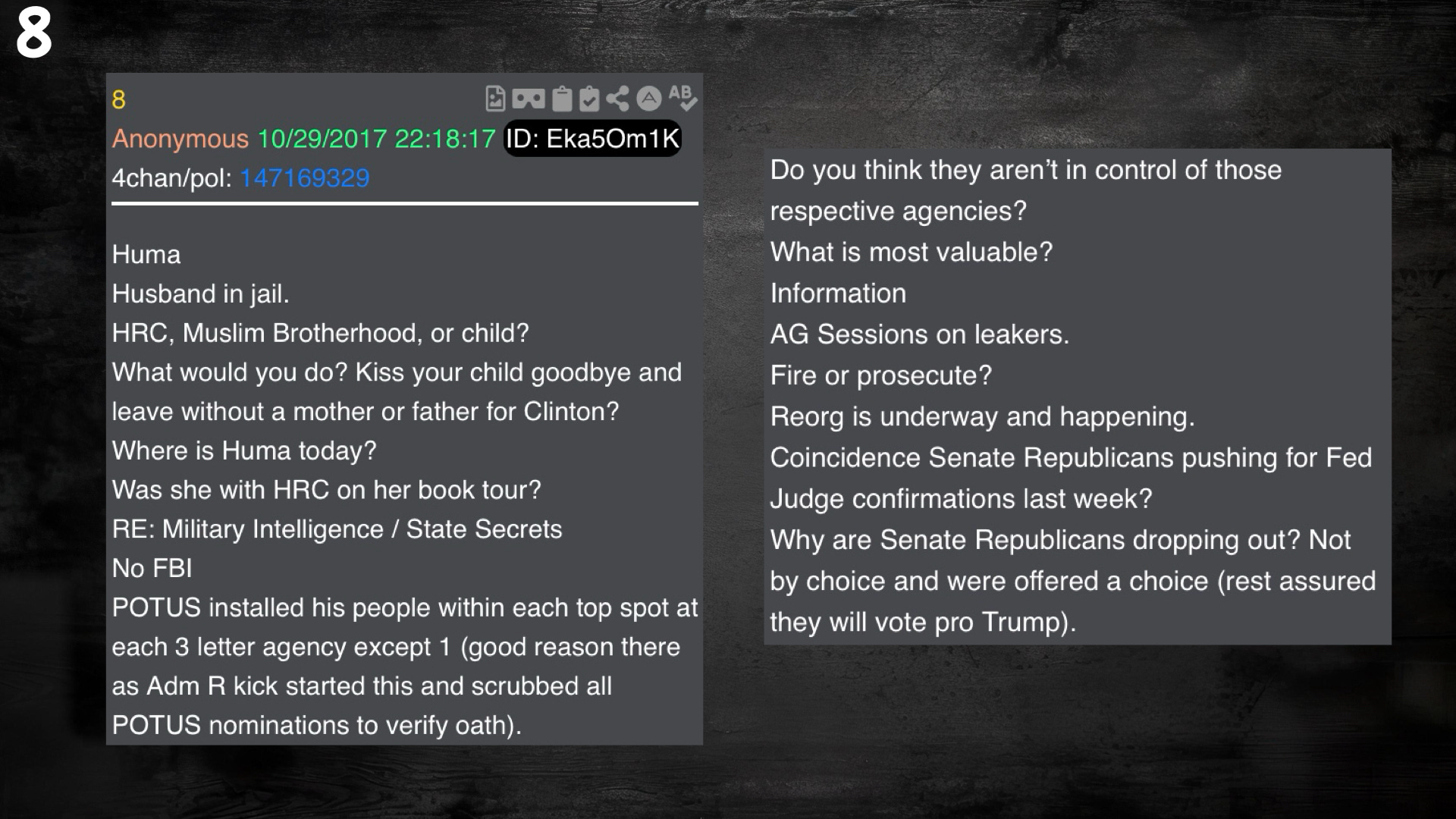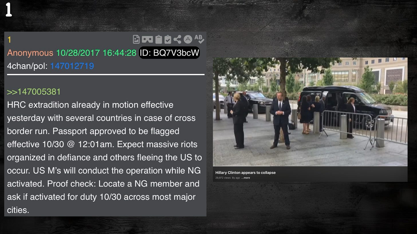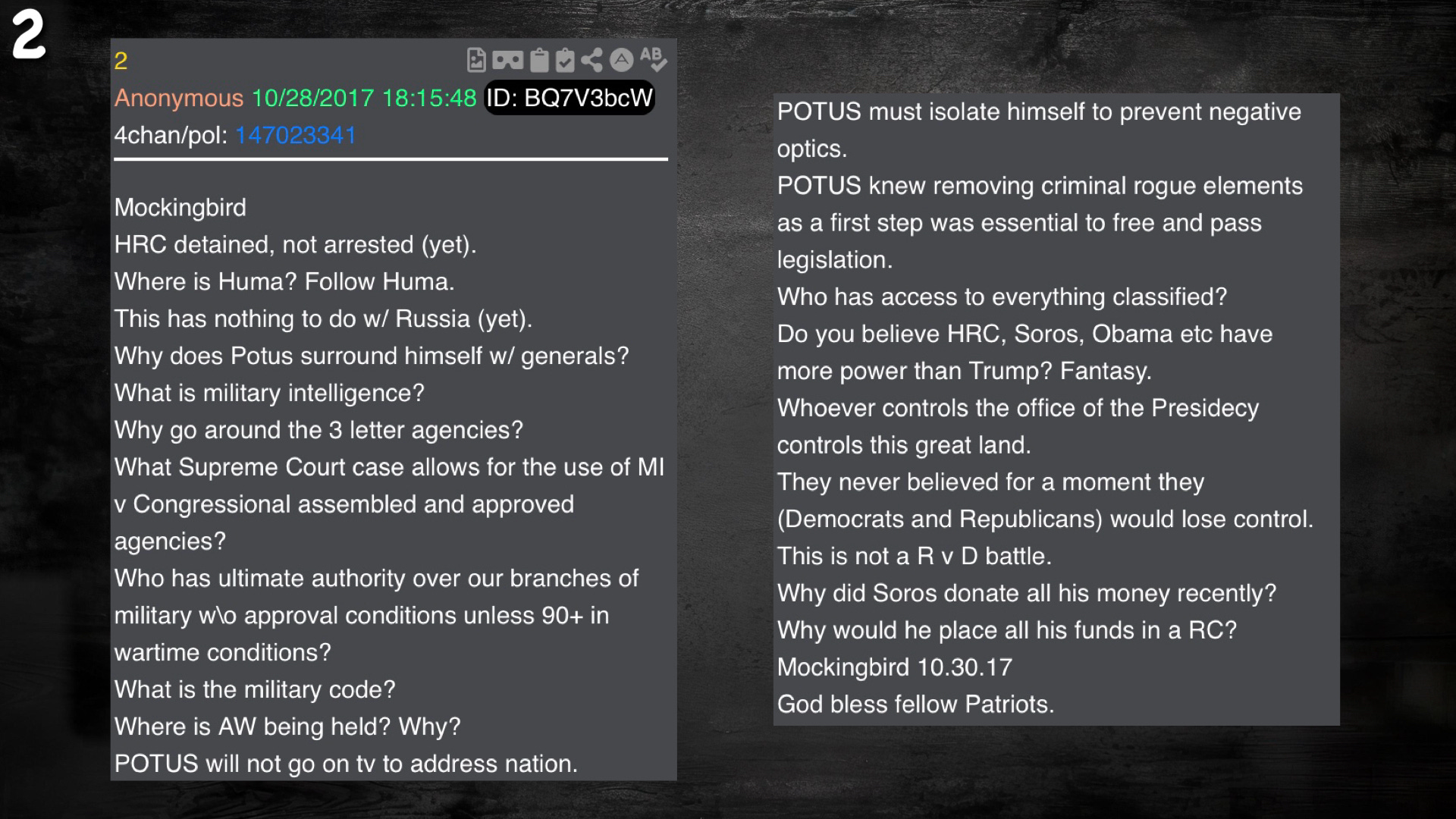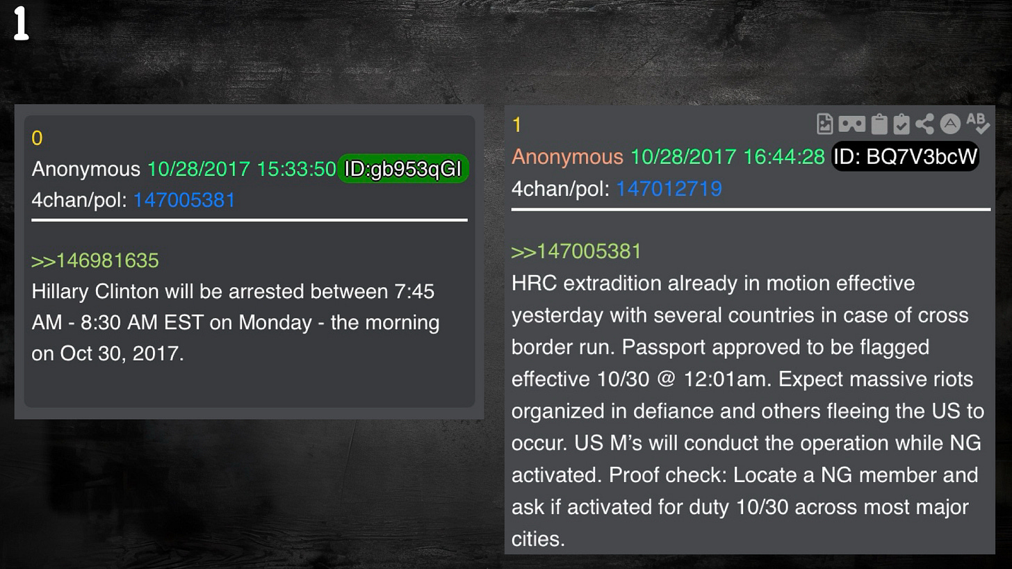 You will notice that the first Drop wasn’t actually made by Q. It was made by an Anon, and it is the famous “Hilary will be arrested” Drop. That single misconception has been the source of a great number of headaches for Q followers, as many have wrongly taken that drop to “disprove” Q.