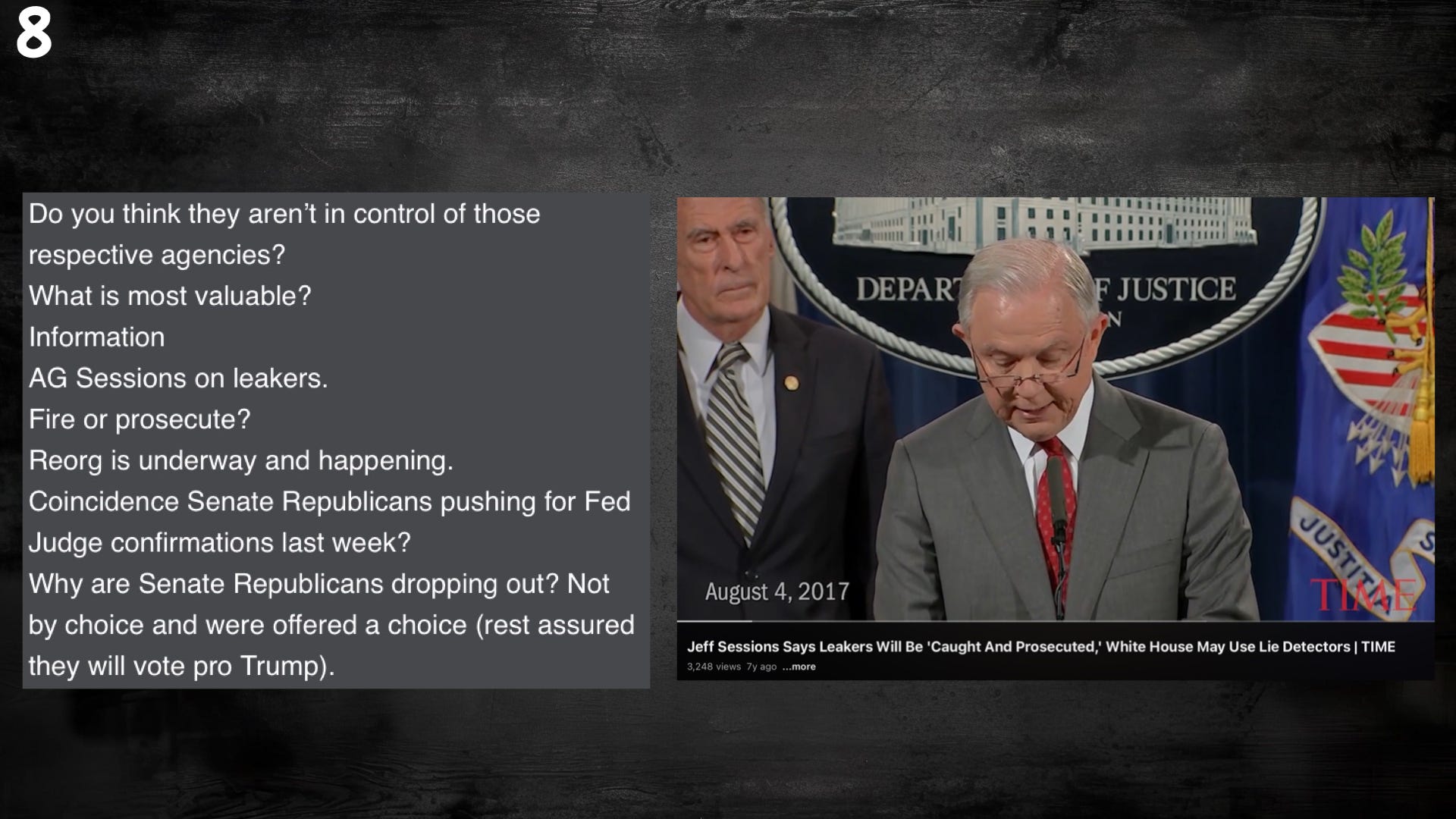 Q tells us that reorganization of these agencies is underway. We are also told in no uncertain terms that many of the Senate Republicans who were dropping out were not doing so of their own volition. At this point, there was a war going on behind the scenes. With Democrats and Republicans alike being brought to heel. This was the beginning of the cleansing of our Government. A cleansing which continues to this day.