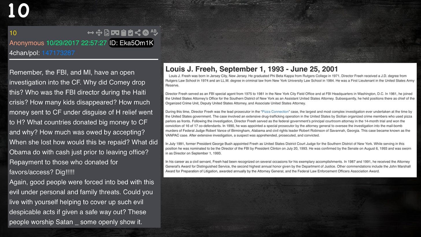 Q asks us who was the FBI director during the Haiti Crisis. The answer is Louis Freeh. He was effectively the Clinton’s right hand man, and a man that was more than capable of hiding their numerous crimes.