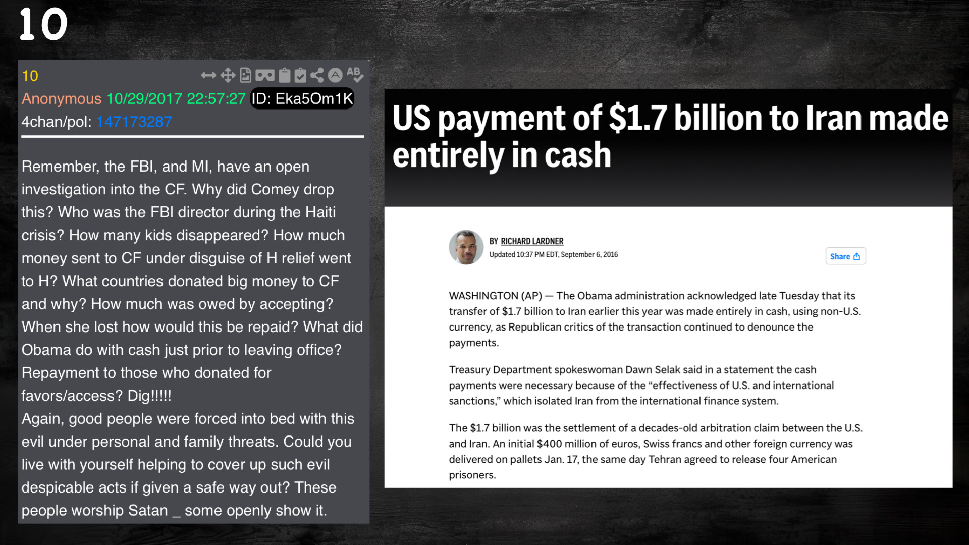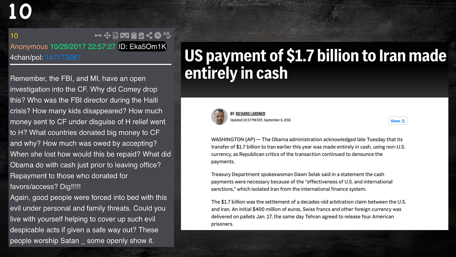 Q then asks us about what Obama did with some cash right before leaving office. The answer? He sent $1.7b in cash to Iran on January 17th, 2017 (Whew, that is an awful lot of 17’s). Q then infers that this money was in part, paying money back that was given to Hilary under the promise of her winning the election.