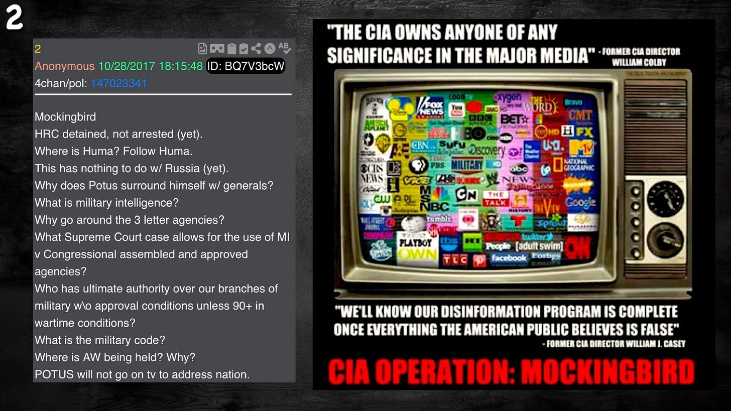 At the very top of this drop Q mentions “Mockingbird”. This is a reference to Operation Mockingbird. A CIA program designed to exert control and influence over the mainstream media. We will certainly be talking more about Operation Mockingbird as the drops unfold, but for now - enjoy this video discussing the creation and usage of Operation Mockingbird: