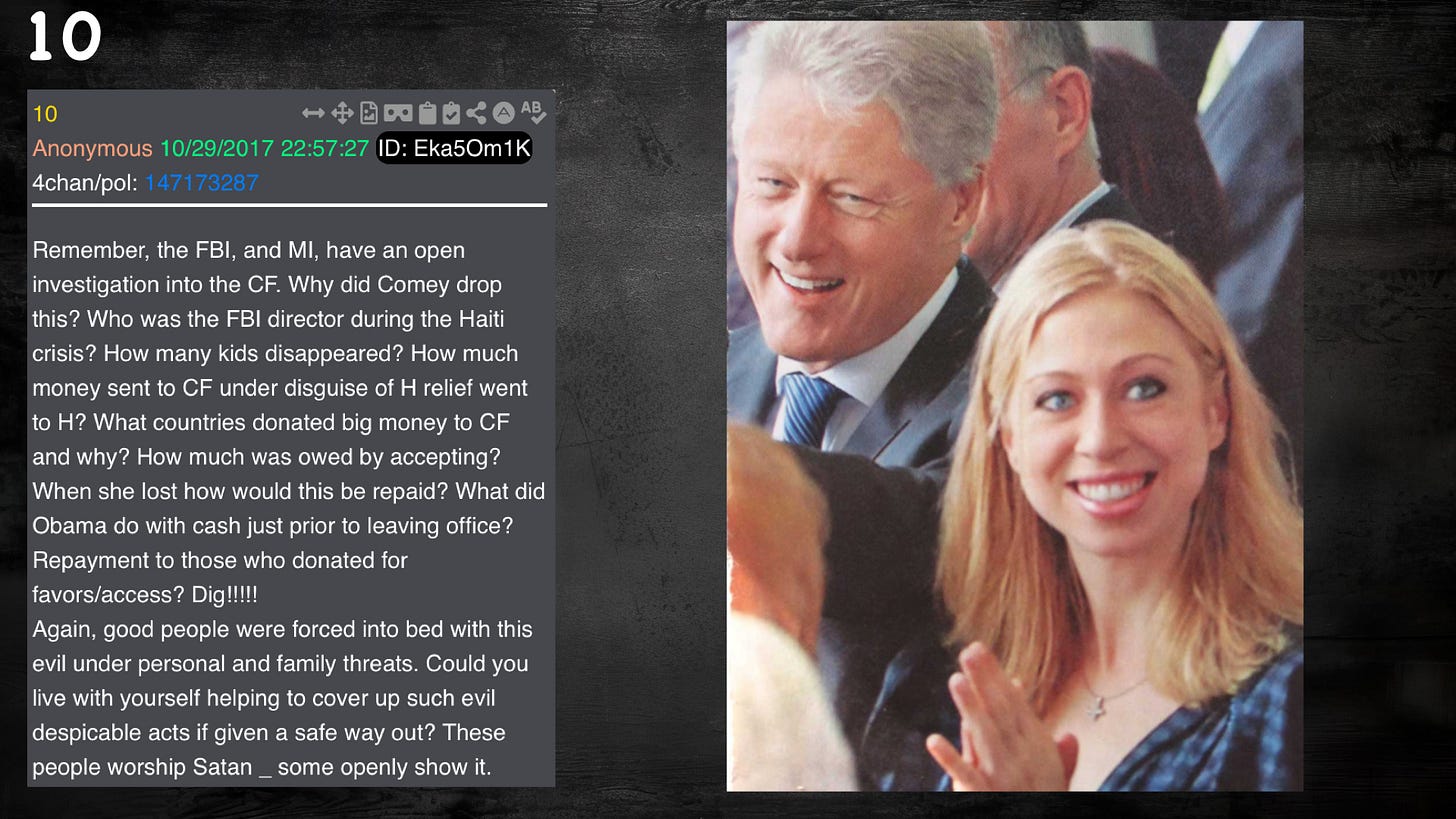 To end this Drop, Q tells us that these people worship Satan, and that some do it openly. I’ve included a picture of Chelsea Clinton (sorry) as an example. Here, you can clearly see her wearing an upside down cross while standing next to her father, Ex-President Billy Jeff.