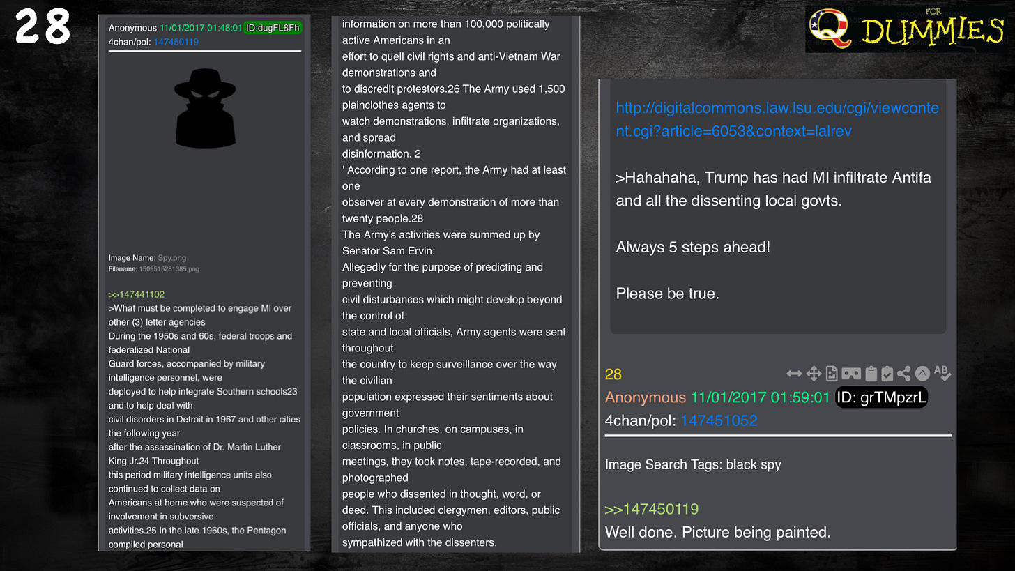 Here we see Q replying to an Anon, one which had done a fantastic breakdown in answering Q’s prior question of “What must be completed to engage MI over other (3) letter agencies”. The Anon breaks down past instances of Presidents using the military to quell and suppress unrest and dissent. The Anon even points out that the military was used to INFILTRATE some of these organizations in order to bring them down from the inside. Anon then shares a link to a piece from LSU which describes, in detail, how Military Intelligence can be utilized on home soil.