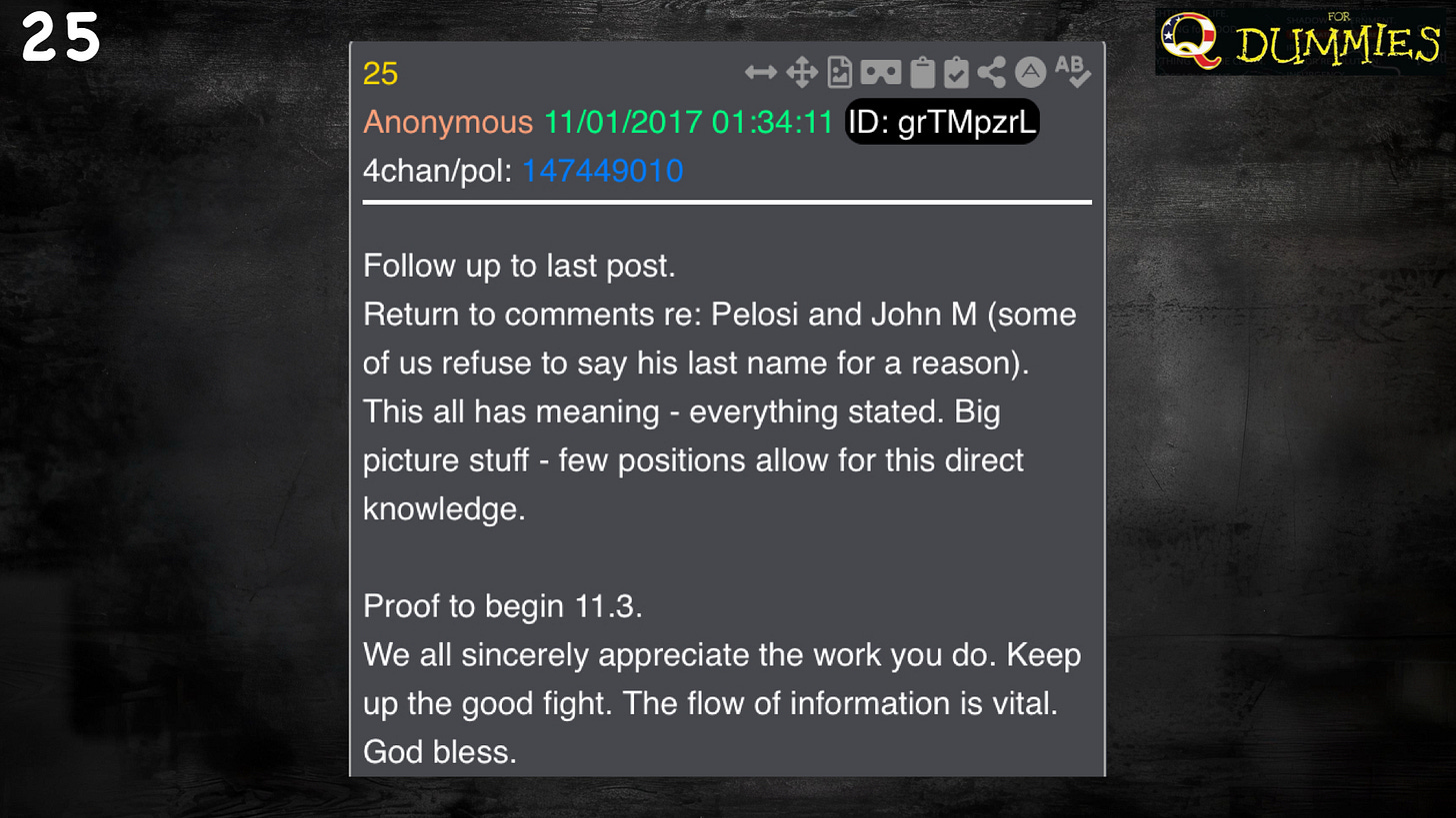 In drop 25, we see Q giving us a follow up to the previous drop. He touches upon Nancy Pelosi and No Name. In the case of McCain, Q is giving us a heads up to the most insane Q-Proof of all time, which would happen less than a year after this drop was made - but more on that when we get there. (Hint: No Name didn’t die because of cancer.)