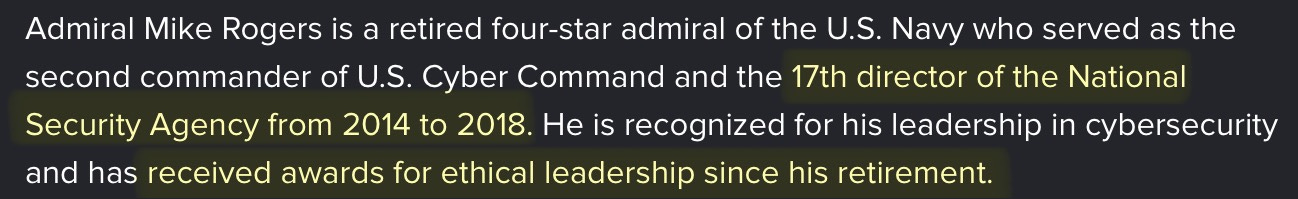 Admiral Rogers was the 17th Director of the NSA. He is highly decorated, and has garnered many awards post retirement for his ethics and leadership. He is also the one who met with President Trump (without Obama’s knowledge) to give Trump the heads up that he was being spied on.