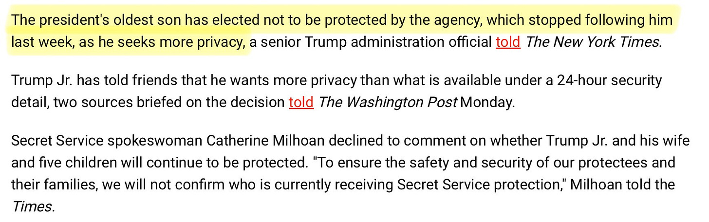 Q then asks us when Donald Trump Jr. dropped his USSS details. The answer is September of 2017 - a month before Q even appeared on the scene.