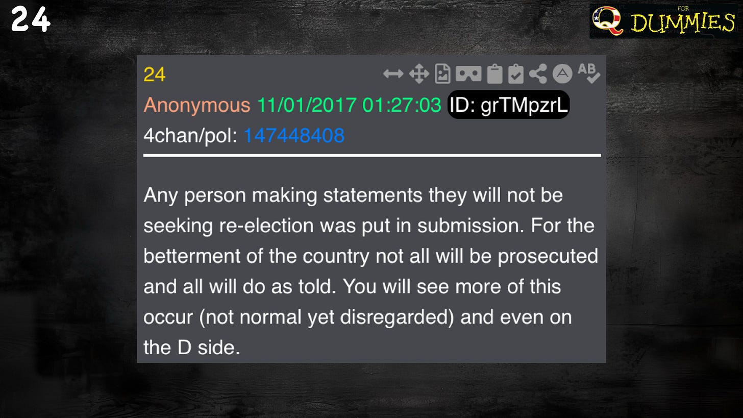 This drop makes it very, VERY clear. What does it make clear? That full control was being implemented early on. Q is flat out telling us here that those not seeking re-election were forced to step aside. Q also tells us that not all of these people will be going to prison, which seems to imply that some were given deals as witnesses against the deep state.