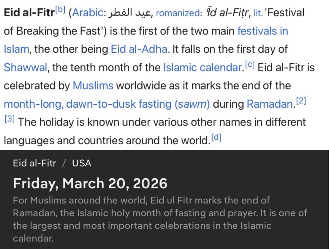 3. Next Friday 3/20 (the day after Bibi mentioned) is one of the “holiest” days in Islam. It is the day of Eid al-Fitr. A major celebration marking the end of Ramadan.